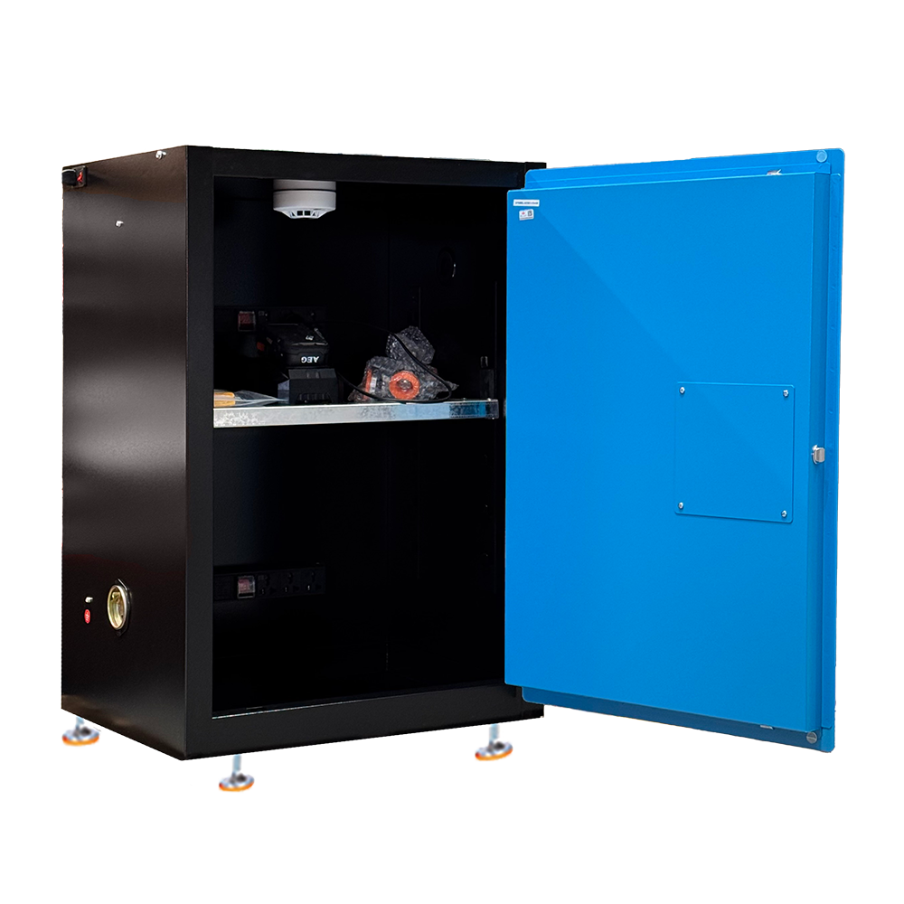 The 45L Lithium Ion Battery Charging Cabinet is purpose built to support safer lithium ion battery storage and charging in environments where space is limited but safety cannot be compromised. Designed to align with FM6050 fire resistant requirements and compliant with OSHA 1910.106 and NFPA 30, this cabinet helps reduce the risk associated with lithium ion battery charging in the workplace.